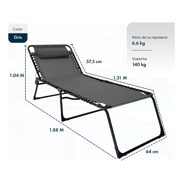 Con su color Gris elegante y atemporal y un largo de $1.88 \text{ m}$, este camastro es sinónimo de descanso y durabilidad.